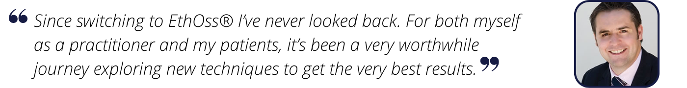 Following the launch of EthOss in 2015, Dr Ainsworth quickly adopted the new material, incorporating it into his practices. Under the tutelage of EthOss co-founder Dr Peter Fairbairn, Dr Ainsworth enjoyed tremendous success following his adaptation of the tenting technique and its use during dental implant surgery.