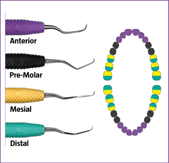 Each colour corresponds to a specific area of the mouth, helping clinicians select the right curette at a glance and streamline their workflow.