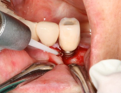 ![]() | Conventional Method: Cleaning the implant surface with a round bur damages the thread or crushes the fixture, which is not good for the re-osseointegration of the implant. |