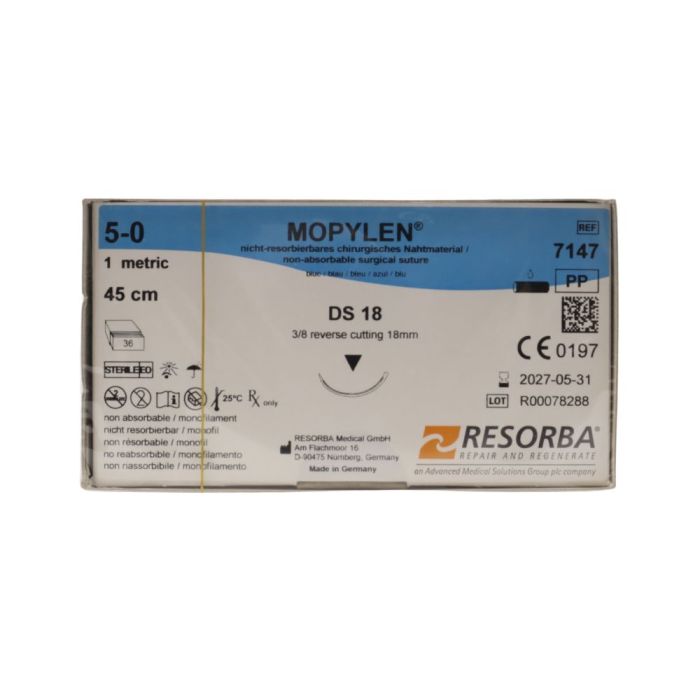 Resorba Mopylen is a synthetic, non-absorbable surgical suture made from isotactic polypropylene through a dry spinning process. Known for its hydrophobic nature, Mopylen absorbs virtually no water and remains chemically inert, ensuring minimal tissue reaction.